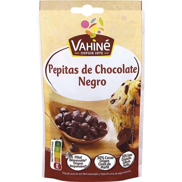 La marca de las pepitas de chocolate negro es Vahiné.