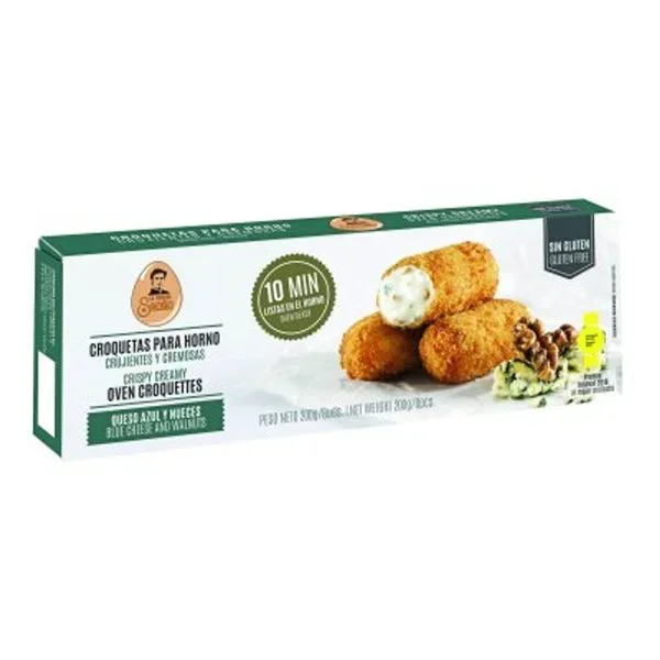 Leche entera, pan rallado (almidón de maíz, harina de arroz, levadura, jarabe de azúcar invertido, azúcar, sal, fibra de bambú, aceite de oliva, estabilizantes E 412, E 464 y E450i y gasificante E 500ii), encolante [agua, fécula y almidones, proteína de guisante, sal, maltodextrina, emulgentes (E 451i y E 412), conservante (E 200) y colorantes (E 160c y E 101ii)], aceite de girasol, harina de arroz, queso azul (4 %) (leche entera pasteurizada de vaca, nata, proteínas de la leche (LECHE), sal, cuajo, fermentos lácticos, Penicilium Roqueforti), fécula de patata, nueces (3 %), gelatina bovina, dextrosa, almidón de tapioca y sal.