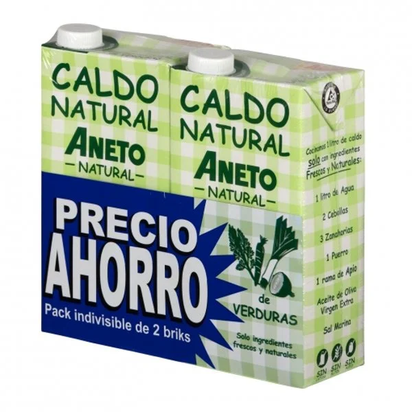 2 lCaldo natural de verduras Aneto sin gluten y sin lactosa pack de 2 briks de 1 l.