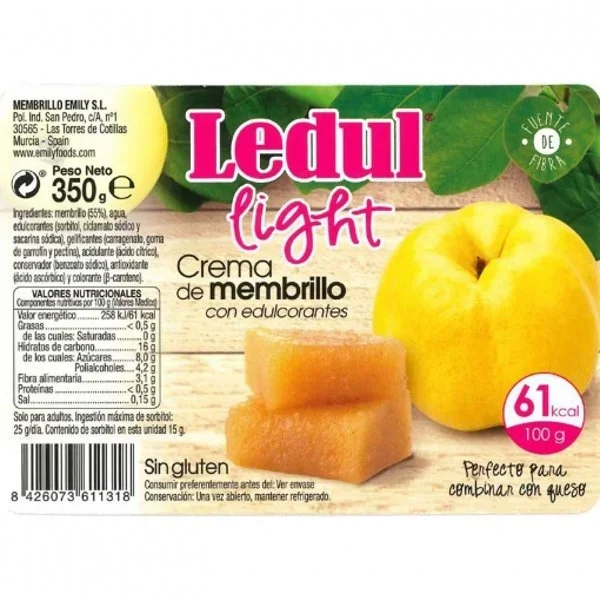 La Crema de Membrillo Light Ledul contiene sorbitol, ciclamato sódico y sacarina sódica como edulcorantes.