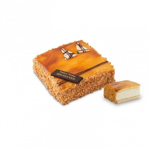 Nata 35% [nata (leche) pasteurizada, estabilizante (E407)], bizcocho [huevo pasteurizado, azúcar, almidones (maíz, tapioca), humectante (E422), harina de arroz, albúmina de huevo, agua, emulgentes (E471, E477, E470a), estabilizantes (E415, E1520), espesante (E464), aroma, sal], yema confitada 13,9% [azúcar, huevopasteurizado, jarabe de glucosa, almidón modificado de maíz, corrector de acidez (E334), conservadores (E202, E281), colorantes (E120, E160b)], crocante de almendra(azúcar, almendra), gelatina líquida [jarabe de azúcar invertido, agua, azúcar, estabilizante (E440), correctores de acidez (E330, E450, E341), conservador (E202)], azúcar, agua, gelatina concentrada [jarabe de glucosa y fructosa, agua, azúcar, caramelo (azúcar, agua), gelificantes (E440, E415), colorante (E150d), acidulante (E330), aroma, conservador (E202)], decoración [crema de cacao (azúcar, cacao desgrasado en polvo, aceite de girasol, grasa de palma, grasa de palmiste parcialmente hidrogenada, suero de lecheen polvo, pasta de avellana, grasa de palma totalmente hidrogenada, emulgente (lecitina de soja), aromas), chocolate negro (pasta de cacao, azúcar, manteca de cacao, emulgente (lecitina de soja), aroma natural), chocolate blanco (azúcar, manteca de cacao, lechedesnatada en polvo, materia grasa láctea(leche), emulgente (lecitina de soja), aroma natural, aroma), manteca de cacao, grasa de palma totalmente hidrogenada, colorantes (E100, E172, E101)].