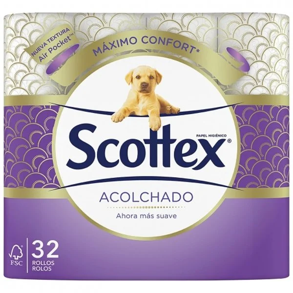 Este paquete contiene 32 rollos de papel higiénico Scottex Acolchado.