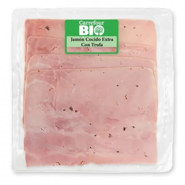 Este producto es jamón cocido extra en lonchas, con trufa, de la marca Carrefour Bio.