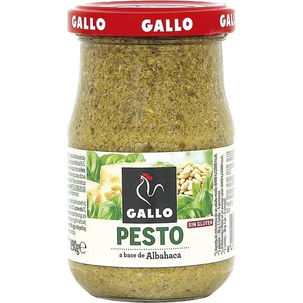 Campaña: Aceite de girasol (34%), albahaca (29%), patatas, jarabe de glucosa, anacardos (6,8%), queso grana padano (4,5%) (contiene proteínas de huevo), queso pecorino (4,5%), sal, aceite de oliva extra virgen (1%), piñones (1%), corrector de acidez: ácido láctico y ajo Fuera de campaña: Mezcla a base de albahaca 52,7% (albahaca 29%, aceite de girasol, sal, corrector de acidez: ácido láctico), aceite de girasol 13,45%, patatas, jarabe de glucosa, ANACARDOS 6,8%, QUESO grana padano 4,5% (contiene proteínas de HUEVO), QUESO pecorino romano 4,5%, aceite de oliva virgen extra 1%, piñones 1%, sal, corrector de acidez (ácido láctico), ajo