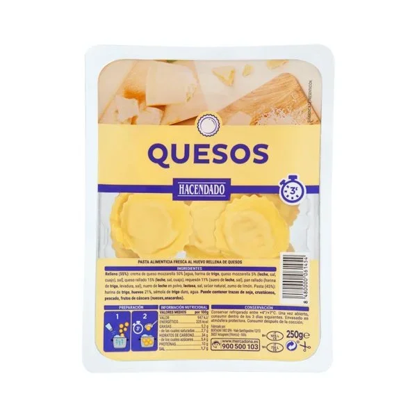 RELLENO (55%): ricota 23,7% (suero de leche, nata (leche), sal), salsa bechamel (leche semidesnatada, harina de trigo blando, agua, mantequilla (leche), almidon de maiz, azucar, sal), nata (leche), pan rallado (harina de trigo, levadura, sal), lactosa, aceite de semillas de girasol, queso Gorgonzola DOP 5% (leche, sal, fermentos lácticos, cuajo, Penicillium Candidum), queso Gouda 5% (leche, sal, fermentos lácticos, cuajo), queso mozzarella 4% (leche, sal, cuajo), suero de leche en polvo, queso Emmental 2% (leche, sal, fermentos lácticos, cuajo), queso Cheddar 2% (leche, sal, fermentos lácticos, cuajo), sal. PASTA (45%): Harina de trigo, huevos 21%, sémola de trigo duro, agua. Puede contener trazas de soja, crustáceos, pescado, frutos de cáscara, mostaza. P RECHEIO (55%): ricota 23,7% (soro de leite, creme (leite), sal), molho bechamel (leite parcialmente desnatado, farinha de trigo, agua, manteiga (leite), amido de milho, açucar, sal), creme (leite), pão ralado (farinha de trigo, fermento, sal), lactose, óleo de girassol, queijo Gorgonzola DOP 5% (leite, sal, culturas lácticas, coalho, Penicillium Candidum), queijo Gouda 5% (leite, sal, culturas lácteas, coalho), queijo mozzarella 4% (leite, sal, coalho), soro de leite em pó, queijo Emmental 2% (leite, sal, fermentos lácticos, coalho), queijo Cheddar 2% (leite, sal, fermentos lácticos, coalho). MASSA (45%): farinha de trigo, ovos 21%, sémola de trigo duro, água. Pode conter vestigios de soja, crustáceos, peixe, frutos de casca rija, mostarda.