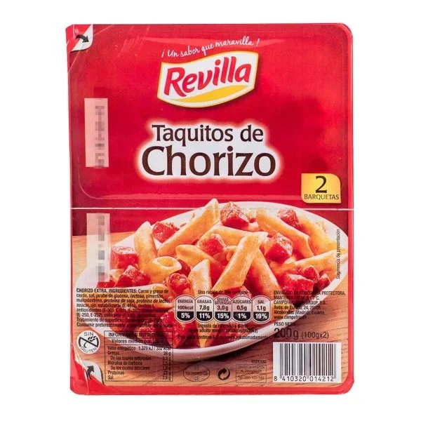 La superficie de los Taquitos de Chorizo Extra Revilla recibe un tratamiento con conservadores (E-202, E-235).