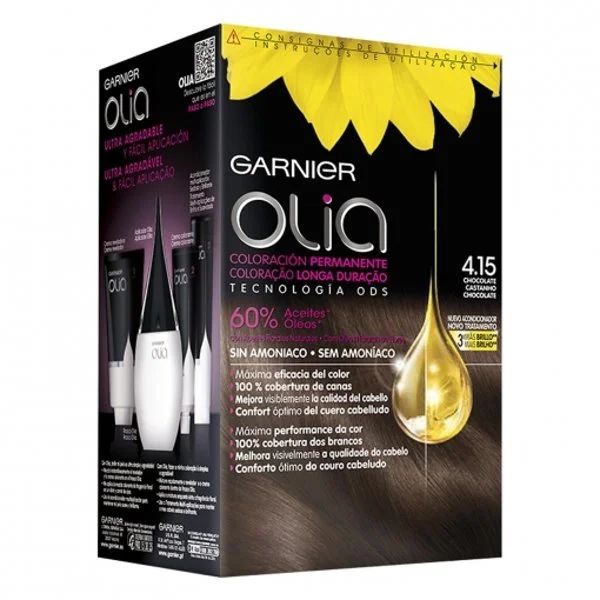 Se trata de un tinte capilar permanente, específicamente el tono 4,15 Chocolate de la marca Olia.