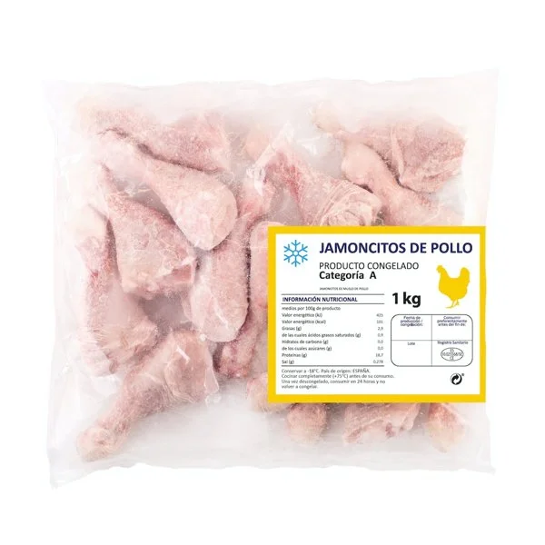 Son la parte inferior de la pata del pollo, también conocida como muslo, que ha sido congelada para su conservación. Este producto contiene 1 kg de jamoncitos de pollo congelados, listos para cocinar.