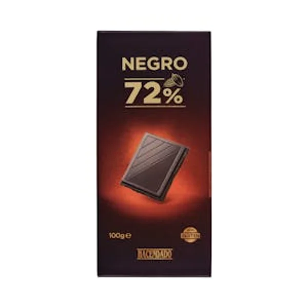 Pasta de cacao, azúcar, manteca de cacao, emulgente (lecitina de soja) y aroma. Cacao: 72% mínimo. Puede contener trazas de frutos de cáscara, leche y sus derivados. Sin gluten.