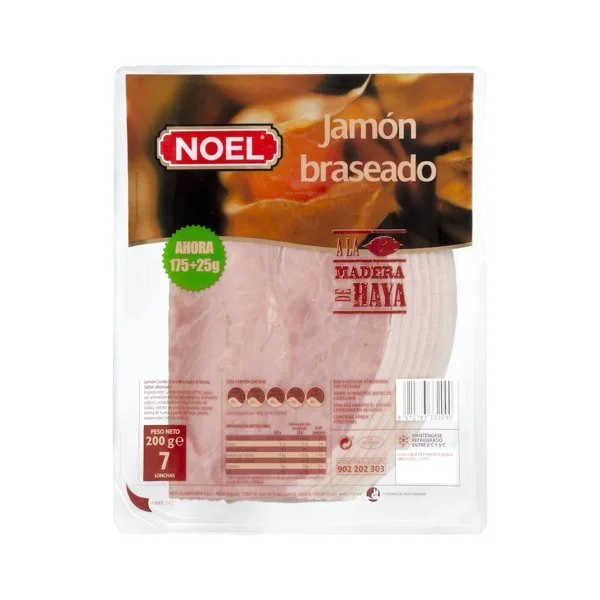 Los ingredientes del jamón cocido braseado Noel son: jamón de cerdo (85%), agua, sal, antioxidantes (lactato potásico, eritorbato sódico), estabilizantes (trifosfato sódico), cloruro de potasio, dextrosa, azúcar, aroma de humo a partir de haya, aroma, conservador (nitrito sódico).