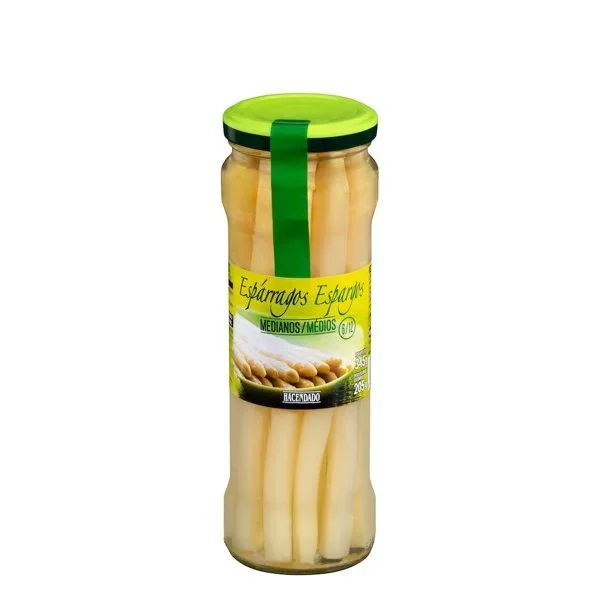 Los espárragos medianos Hacendado son espárragos en conserva, envasados en agua con sal, azúcar y antioxidantes para preservar su frescura y sabor.