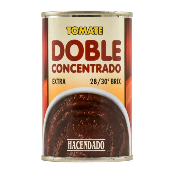 El tomate doble concentrado Hacendado extra es una pasta de tomate espesa y rica en sabor, elaborada a partir de tomate concentrado y una pequeña cantidad de sal.