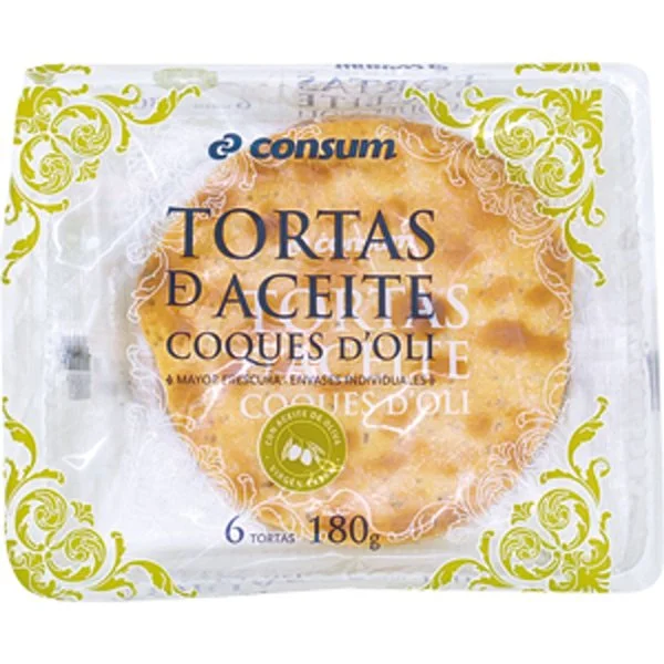 La Torta de Aceite Consum es un producto de panadería elaborado con ingredientes como harina de trigo, aceite de oliva virgen extra, azúcar y semillas de sésamo.