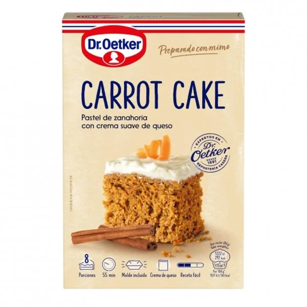 Es un preparado alimenticio en polvo para hacer un pastel de zanahoria, de la marca Dr. Oetker.