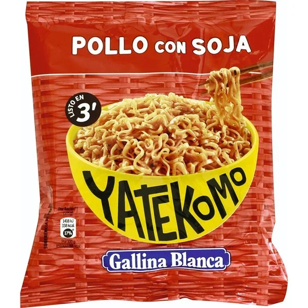 Fideos orientales (92%): harina de TRIGO, aceite de palma, almidón modificado, sal, gasificantes (carbonato de potasio, carbonato de sodio). Aderezo (8%) (salsa de SOJA en polvo 36%** (SOJA, TRIGO, maltodextrina, sal), azúcar, maltodextrina, potenciadores del sabor (E621, E635), sal, extracto de proteínas vegetales, extracto de levadura, aromas (con CEBADA, TRIGO), colorante (caramelo natural), ajo, grasa de pollo 1,3%**, cebolla, pimienta negra, carne de pollo 0,3%**, pimienta blanca).. Puede contener trazas de LECHE, APIO, MOSTAZA, CRUSTÁCEOS.