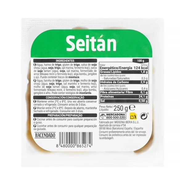 Los ingredientes del seitán Hacendado son: agua, harina de trigo, gluten de trigo, salsa de soja shoyu (agua, soja, trigo, sal marina, fermento koji), salsa de soja tamari (agua, soja, sal marina, fermentado de arroz Mikawa mirin y fermento koji), alga kombu, jengibre y ajo. Puede contener trazas de mostaza.