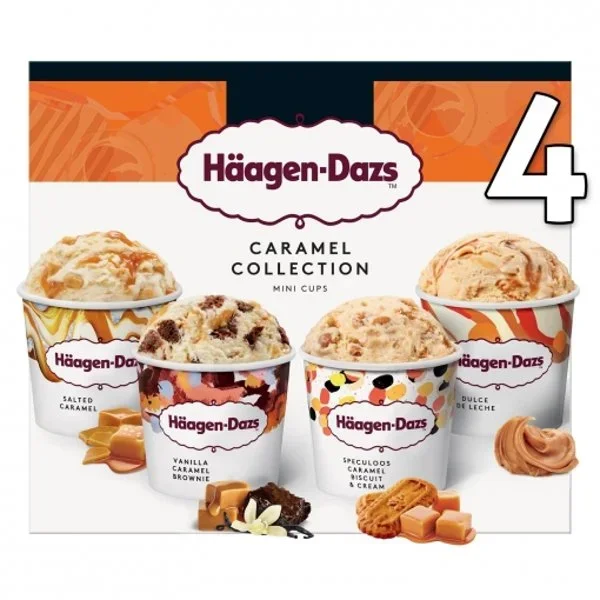 SALTED CARAMEL: Nata pasterizada (29%), agua, leche condensada desnatada con contenido reducido de lactosa, azúcar, jarabe de glucosa, leche condensada, yema de huevo, leche condensada desnatada, mantequilla salada,manteca de coco, mantequilla, sal, emulgente (lecitina de girasol), espesante (pectinas), aromas naturales de vainilla. Alérgenos: ver ingredientes en negrita. Puede contener frutos de cáscara. Sin gluten. VANILLA CARAMEL BROWNIE: Nata pasterizada (30,1%), leche evaporada desnatada, azúcar, agua, leche entera condensada, yema de huevo, harina de trigo, aceites y grasas vegetales (manteca de coco, aceite refinado de girasol), jarabe de glucosa,cacao desgrasado en polvo, huevo, aroma natural de vainilla, almidón de maíz, sal, gelificante (pectinas), aroma natural, gasificante (carbonato ácido de sodio). Alérgenos: ver ingredientes en negrita. CARAMEL, BISCUIT & CREAM SPECULOOS: Nata pasterizada (31,5%), agua, leche condensada desnatada con contenido reducido de lactosa, azúcar, harina de trigo, leche condensada, yema de huevo, jarabe de glucosa, aceites y grasas vegetales (manteca de coco, aceite de nabina), azúcar glaseado, mantequilla concentrada, sal, gasificante (carbonato ácido de sodio), emulgente (lecitina de soja), canela, azúcar cande, aroma natural de vainilla. Alérgenos: ver ingredientes en negrita. DULCE DE LECHE: Nata pasterizada (29,2%), leche evaporada desnatada, agua, azúcar, leche condensada, yema de huevo, jarabe de glucosa, manteca de coco, sal, gelificante (pectinas), aromas naturales de vainilla. Alérgenos: ver ingredientes en negrita. Sin gluten.
