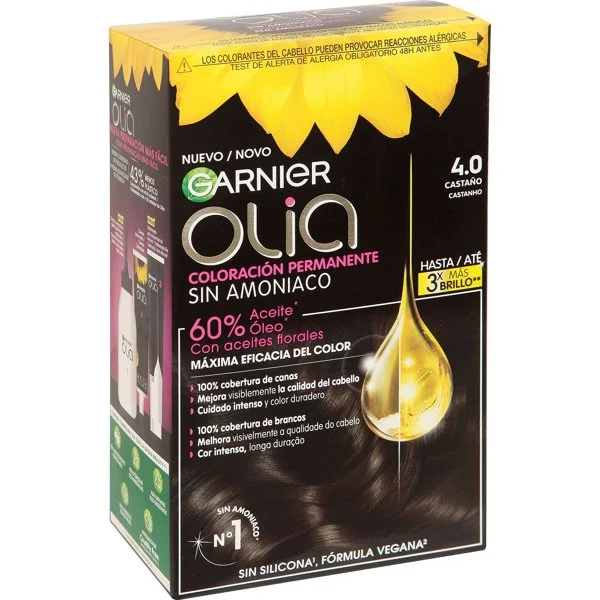 Los ingredientes del tinte castaño Olia incluyen: Paraffinum Liquidum, Aqua, Ethanolamine, Decyl Glucoside, Sodium Lauryl Sulfate, PEG-40 Hydrogenated Castor Oil, 2-Amino-6-Chloro-4-Nitrophenol, m-Aminophenol, Ascorbic Acid, Tocopherol, Hydroxypropyl Guar, Sodium Metabisulfite, Hydroxyethyl-3,4-Methylenedioxyaniline HCI, Thioglycerin, Helianthus Annuus Seed Oil, Camellia Oleifera Seed Oil, Disodium Cocoamphodiacetate, Resorcinol, EDTA, Parfum, Hydrogen Peroxide, Cetearyl Alcohol, Sodium Cetearyl Sulfate, Sodium Salicylate, Phosphoric Acid, Tetrasodium Etidronate, Tetrasodium Pyrophosphate, Behentrimonium Chloride, Cetyl Esters, Trideceth-6, Chlorhexidine Digluconate, Amodimethicone, Isopropyl Alcohol, Citric Acid, Cetrimonium Chloride, entre otros. Consulta la lista completa en la descripción del producto.