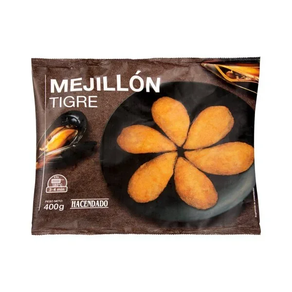 Relleno [(Agua, MEJILLÓN (MOLUSCO) (20+/-3%), harina de TRIGO, aceite de girasol, cebolla frita (cebolla, aceite de oliva virgen, sal y corrector de acidez E-330), LECHE en polvo, pimiento rojo, pimiento verde, sal, extracto de PESCADO y MARISCOS, maltodextrina, vegetales deshidratados (cebolla, tomate, pimentón), aroma de PESCADO, salsa pomodoro (tomate deshidratado en polvo, azúcar, cebolla, almidón modificado, sal y especias), pimienta negra, ajo en polvo y ají)], empanado (harina de TRIGO, agua, almidón, sal, levadura, espesante E-412), MEJILLÓN (MOLUSCO) media concha.