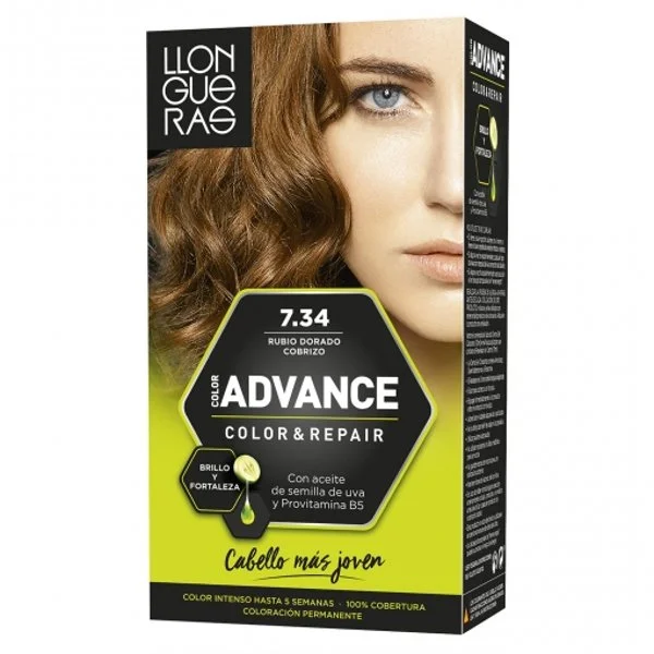 Este producto es un tinte para el cabello de la marca Llongueras, específicamente en el tono rubio dorado cobrizo 7.34.