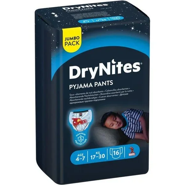16 udPants de noche niño 17-30 kg 4-7 años DRYNITES, paquete 16 uds