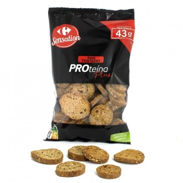 Es un pan tostado con alto contenido de proteínas, comercializado bajo la marca Carrefour.