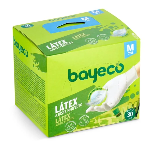 La caja de guantes de látex desechables Bayeco talla M contiene 30 unidades.