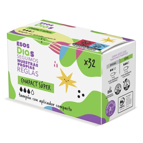 Los tampones Esos Dias con aplicador compact súper están diseñados para flujos menstruales abundantes.