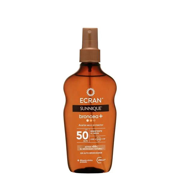 El Aceite Solar Seco Protector FPS 50 Ecran ofrece protección de amplio espectro contra los rayos UVB y UVA.