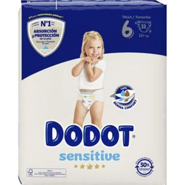 El paquete de Pañales Sensitive Dodot talla 6 contiene 32 unidades.