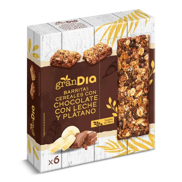 <p>Cereales (43,2%) [copos de avena (29,2%), harina de trigo (9,7%), copos de maíz (3,1%) (maíz, sal, extracto de malta de cebada), harina de arroz (1,2%)], jarabe de glucosa, chocolate con leche (12%) (azúcar, manteca de cacao, leche entera en polvo, pasta de cacao, emulgente (lecitinas (contiene soja)), extracto de vainilla), aceite vegetal de palma, plátano (3,1%) (plátano, aceite vegetal de coco, azúcar), cacao desgrasado en polvo, copos de plátano (2,1%), estabilizante (E420), dextrosa, azúcar, aroma, sal, emulgente (E473). Puede contener trazas de frutos de cáscara y cacahuetes.</p>