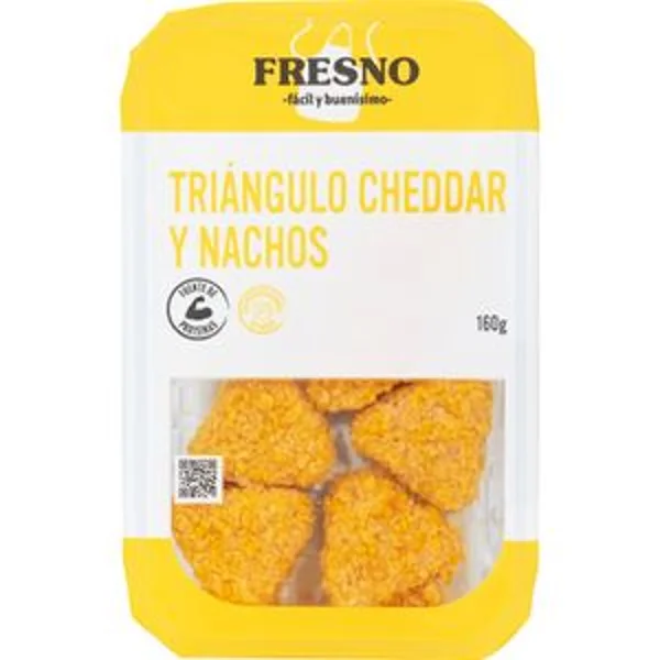Triangulo de queso cheddar y queso fundido con rebozado de maiz y prefrito. plato preparado descongelado. ingredientes: queso cheddar (25%) [leche pasteurizada de vaca, fermentos lácticos, sal, cloruro cálcico(endurecedor), cuajo, colorante: annato], agua, rebozantes (maiz, arroz, dextrosa, sal, gasificantes(difosfato disódico, carbonato acido de sodio), espesante(goma xantana), especias, colorante(extracto de pimenton)), queso fundido (20%) [queso, agua, mantequilla, leche descremada en polvo, sales de fundido(citratos de sodio, polifosfatos), proteinas de leche, sal, acidulante(acido cítrico)], aceite vegetal de girasol, preparado para rebozar (harina de trigo, sal, levadura), aceite de palma, almidones, harina de trigo, condimentos (proteina vegetal hidrolizada, tomate en polvo, especias, antioxidantes(ascorbato de sodio), aromas), sal y suero de leche en polvo. puede contener trazas de apio, pescado, crustaceos, moluscos, mostaza, huevo, soja y frutos de cascara.