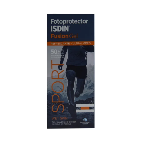 0.1 lISDIN Protector solar con textura gel, resistente al sudor y al agua con factor de protección 50+ (muy alta) ISDIN Fusión gel sport.