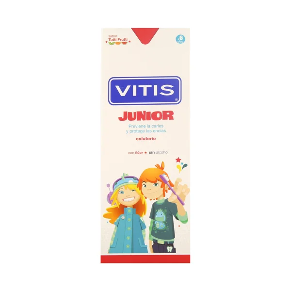 0.5 lVITIS Enjuague bucal diario, con flúor y sin alcohol, con sabor a Tutti Frutti, a partir de 6 años VITIS Junior 500 ml.