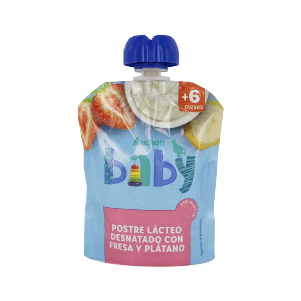 0.09 kgALCAMPO BABY Bolsita de postre lácteo desnatado con fresa y plátano, a partir de 6 meses ALCAMPO BABY 90 g.