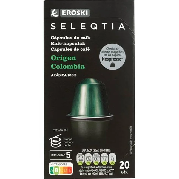 El Café Colombia cápsulas comp. Nespresso SELEQTIA, caja 20 uds está disponible en el supermercado eroski. Su precio actual es de 5.20€, lo que lo convierte en una opción de gama media para su categoría. Descubre si este producto es la mejor opción para ti.