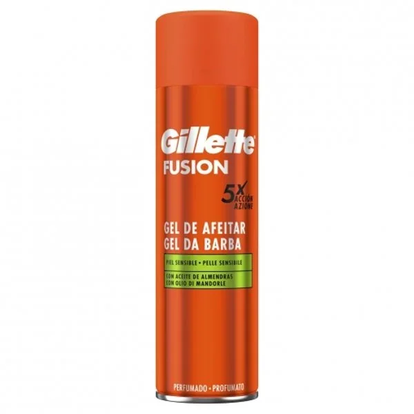 El gel de afeitado Gillette Fusion con aceite de almendras ofrece una acción x5, proporcionando un afeitado suave y ayudando a proteger la piel sensible durante el afeitado.