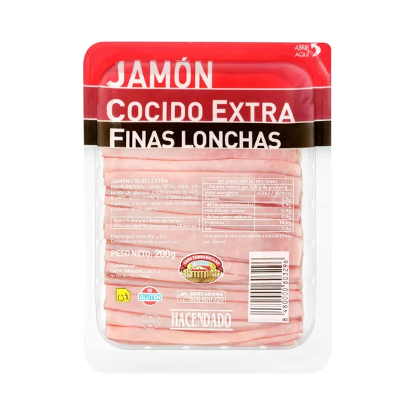 Es un fiambre de jamón cocido, envasado en finas lonchas, de la marca Hacendado.