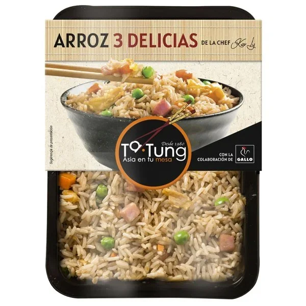 Arroz cocido (64%), zanahoria (6%), huevo líquido pasteurizado de gallinas criadas en el suelo (5%), bacon ahumado (5%) [Bacon de cerdo (78%), agua, almidón de patata, sal, proteína de soja y de cerdo, estabilizantes (difosfatos, trifosfatos, polifosfatos, algas echema transformadas), azúcar, dextrosa, fibra vegetal, aroma, aroma de humo, potenciador del sabor (glutamato monosódico), antioxidantes (ascorbato sódico, citratos sódicos) y conservador (nitrito sódico)], guisantes (4%), aceite vegetal (nabina), cebolla, salsa de ostras (Agua, azúcar, extracto de ostras [ostras (moluscos), agua, sal], sal, almidón de maíz modificado, potenciador del sabor (glutamato monosódico), harina de trigo, colorante (caramelo cáustico)), salsa de soja [agua, soja, harina de trigo, sal, conservadores (sorbato potásico) y colorante (caramelo natural)], salsa yakitori [agua, salsa de soja (agua, soja, trigo, sal), azúcar, vino de arroz dulce (sirope de glucosa, agua, azúcar, sake, vinagre y sal), almidón de maíz, sal, regulador de acidez (ácido cítrico), potenciador del sabor (glutamato monosódico), conservadores (sorbato de potasio y benzoato de sodio)], acidulantes (lactato potásico y acetato sódico), sal, extracto de levadura, potenciador del sabor (glutamato monosódico).